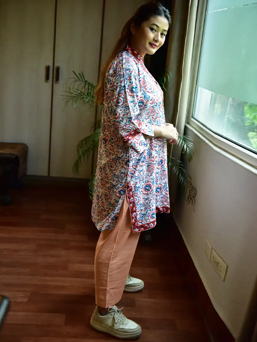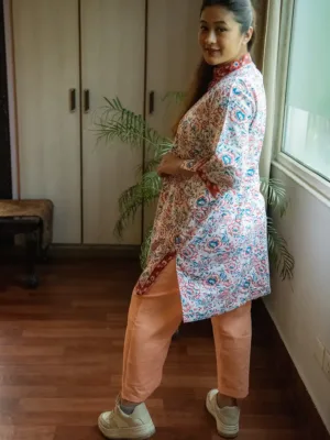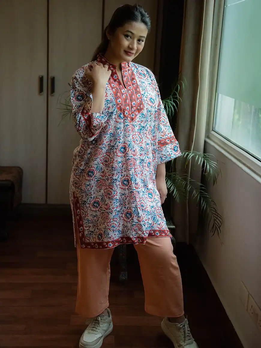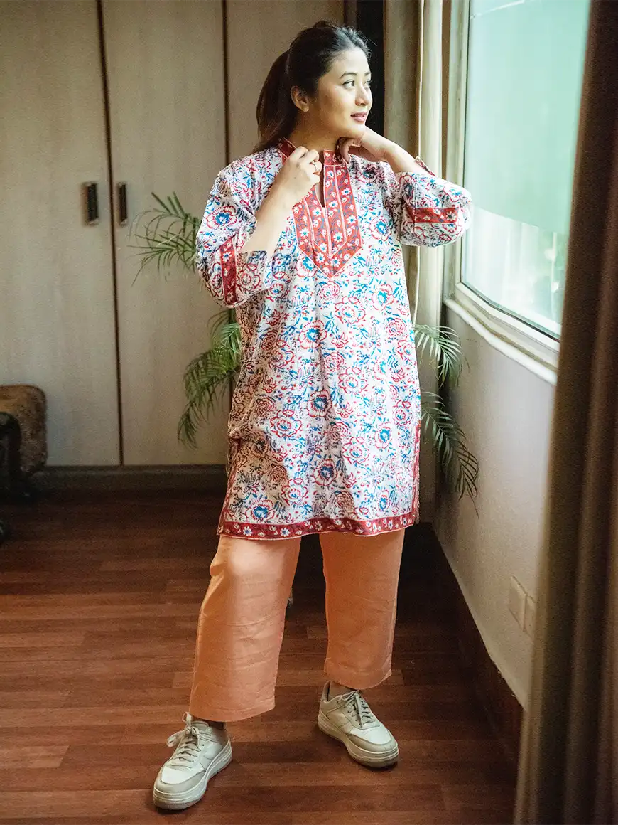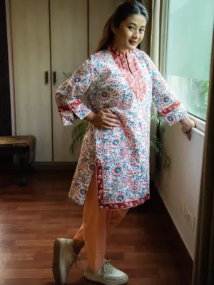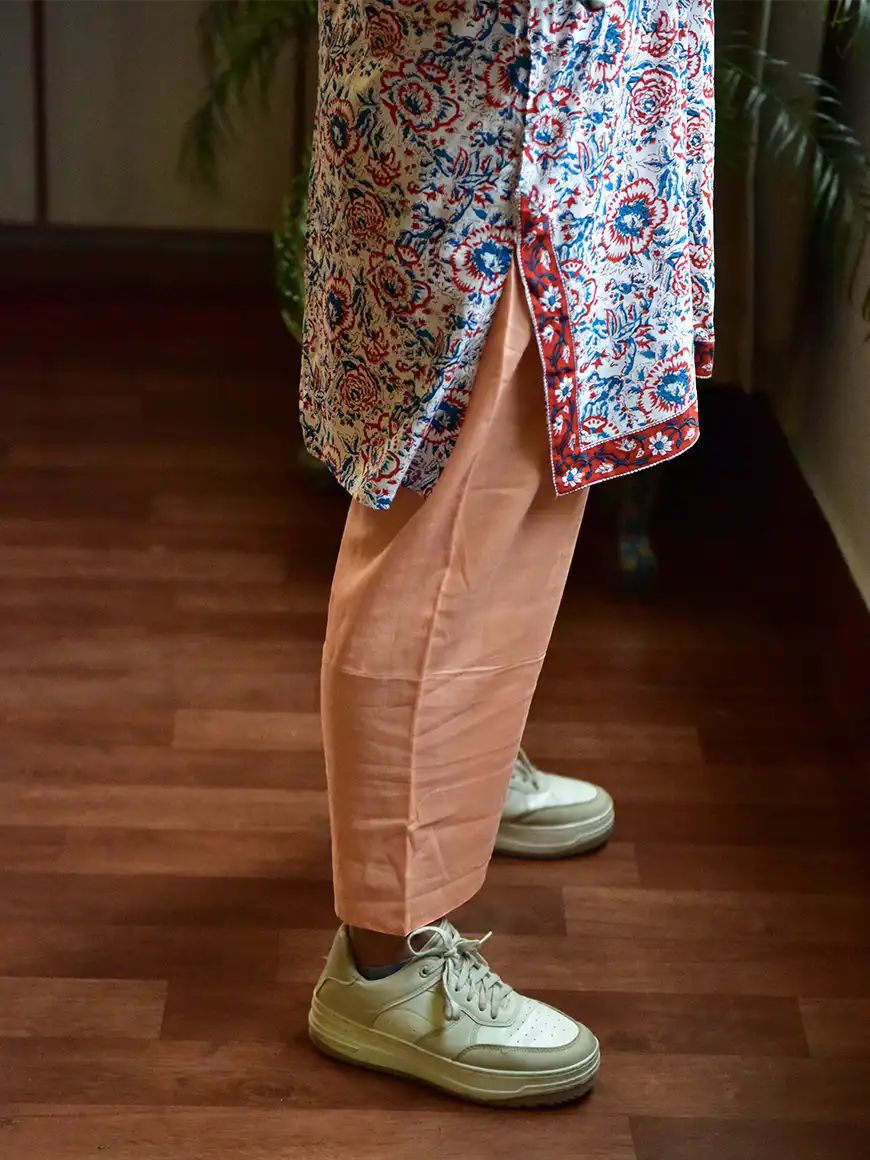 Product Descriptions: White with floral print kurta with elastic peach pants.