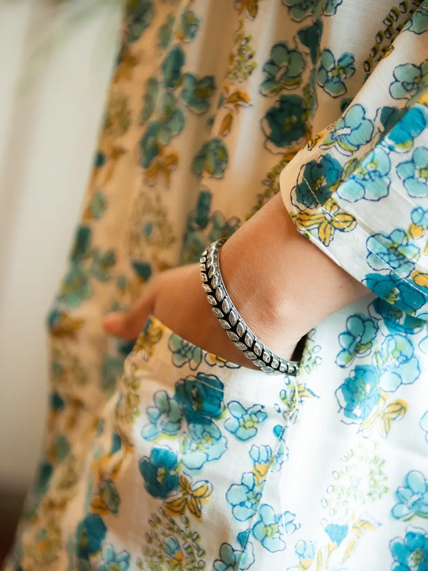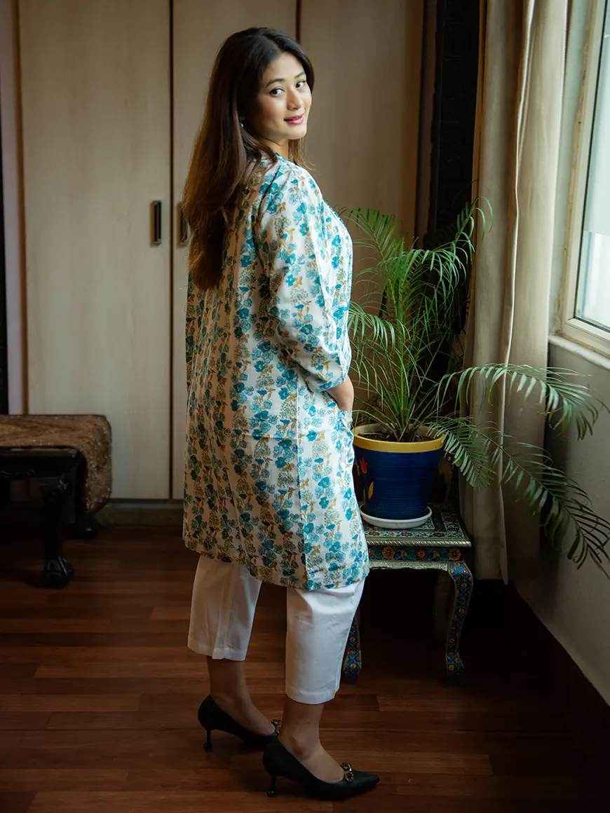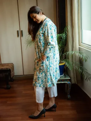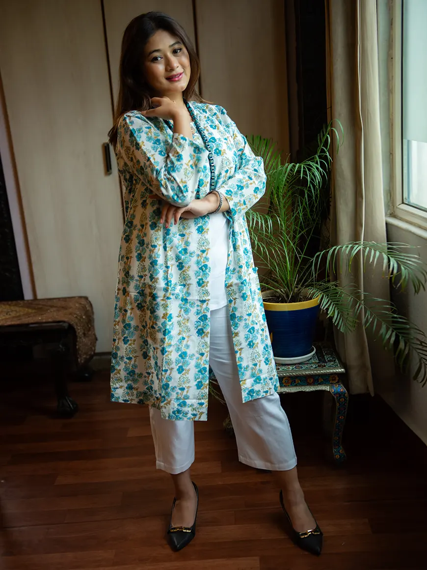 Plain white Mulmul kurta and pant with front open white and blue floral printed jacket with pockets