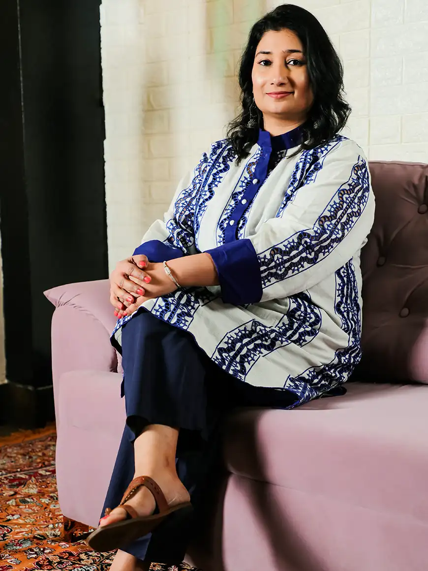 Product Descriptions: Off White kurta with bright dark blue cut thread work with plain dark blue rolled sleeves and high neck line dark blue collar with front open button line to waist line